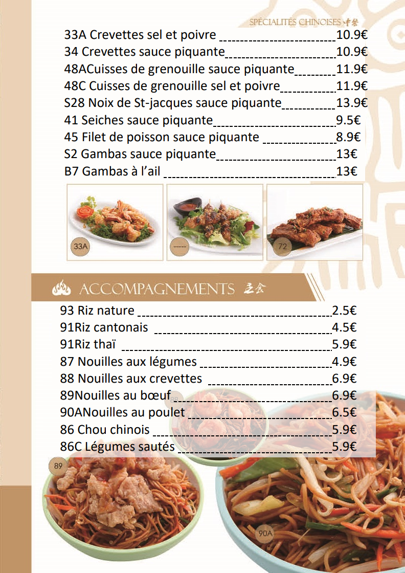 93 Riz nature 2.5€ 91Riz cantonais 4.5€ 91Riz thaï 5.9€ 87 Nouilles aux légumes 4.9€ 88 Nouilles aux crevettes 6.9€ 89Nouilles au bœuf 6.9€ 90ANouilles au poulet 6.5€ 86 Chou chinois 5.9€ 86C Légumes sautés 5.9€